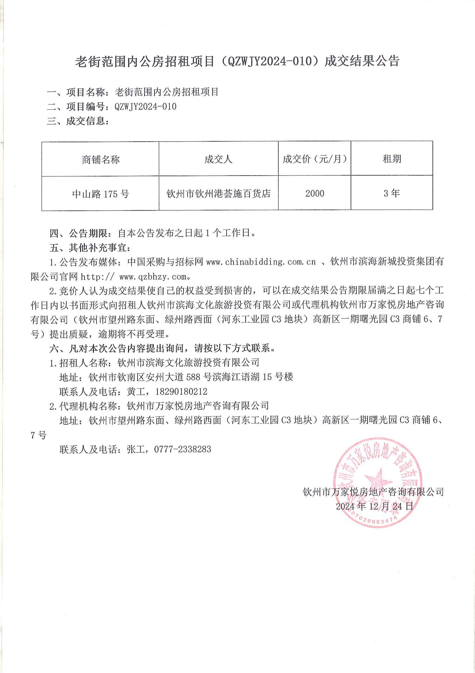 老街范圍內(nèi)公房招租項(xiàng)目(QZWJY2024-010)成交結(jié)果公告