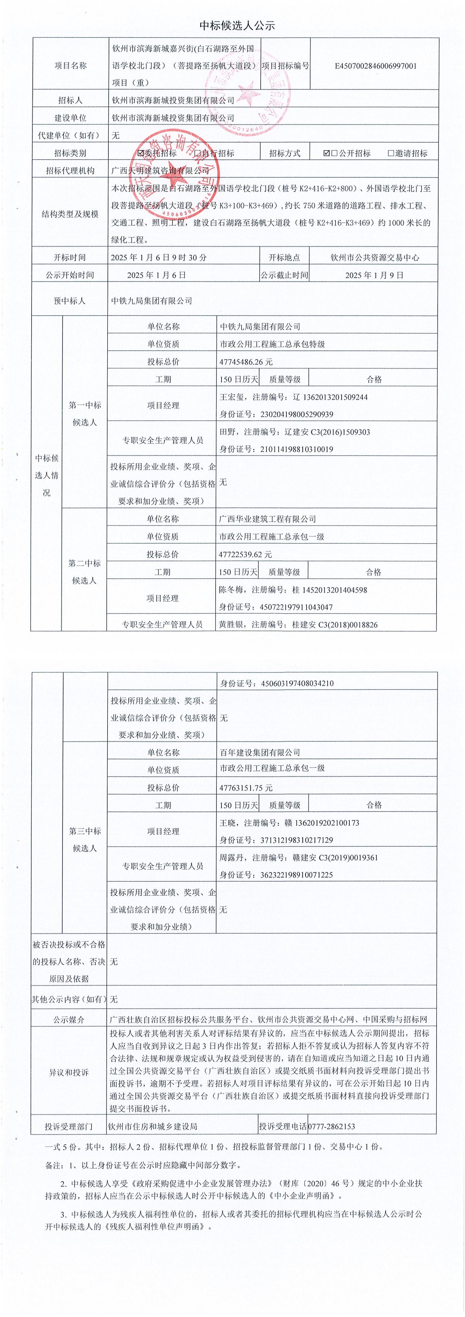 欽州市濱海新城嘉興街(白石湖路至外國(guó)語(yǔ)學(xué)校北門(mén)段)(菩提路至揚(yáng)帆大道段)項(xiàng)目(重)中標(biāo)候選人公示