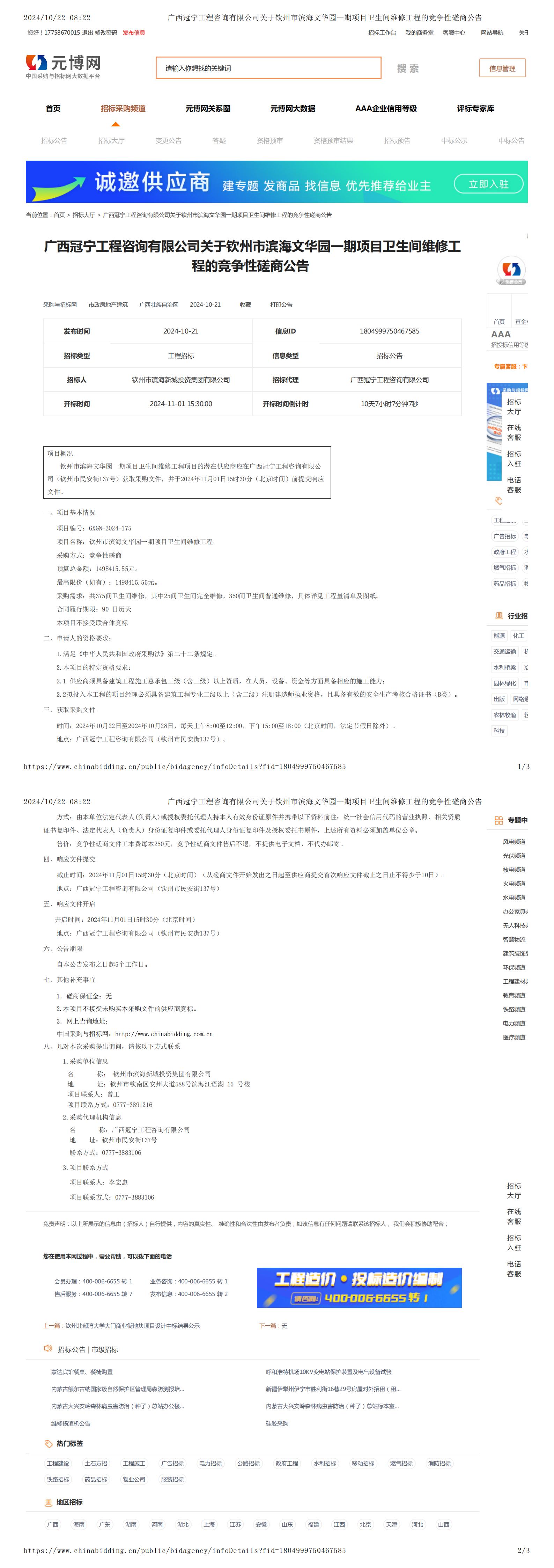廣西冠寧工程咨詢有限公司關(guān)于欽州市濱海文華園一期項目衛(wèi)生間維修工程的競爭性磋商公告