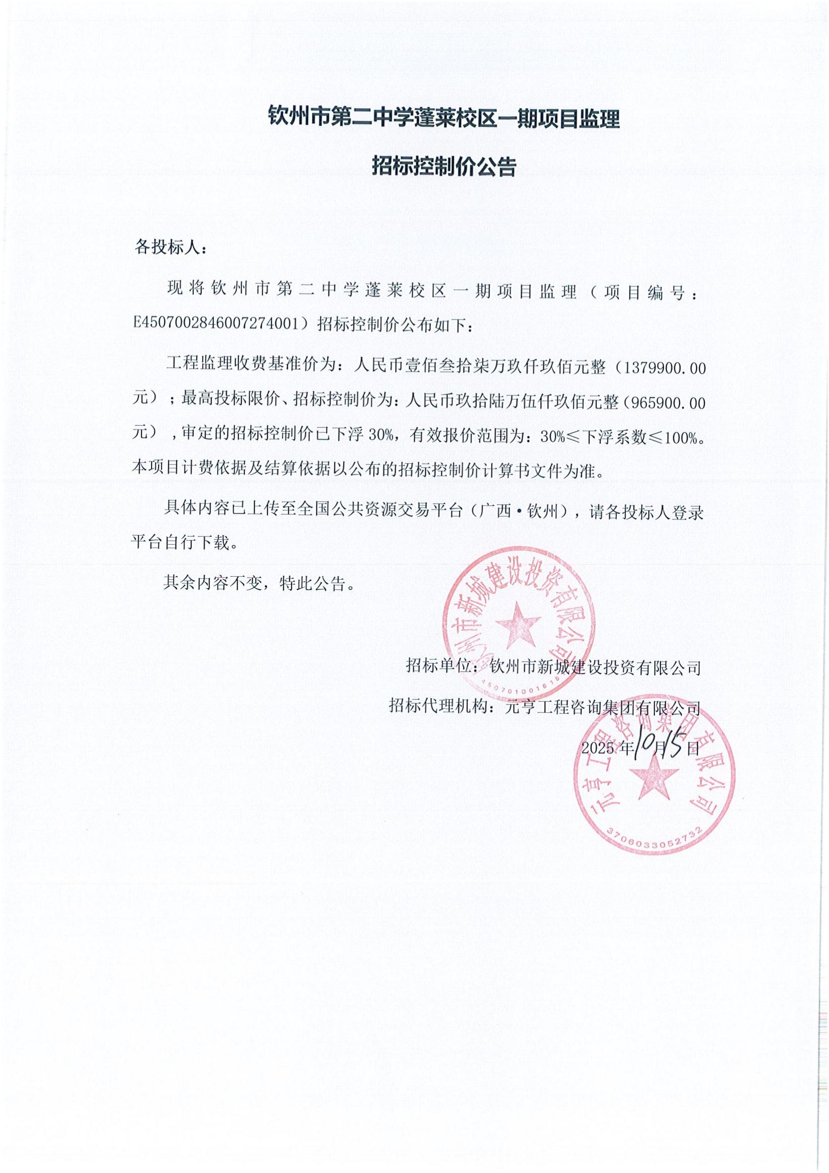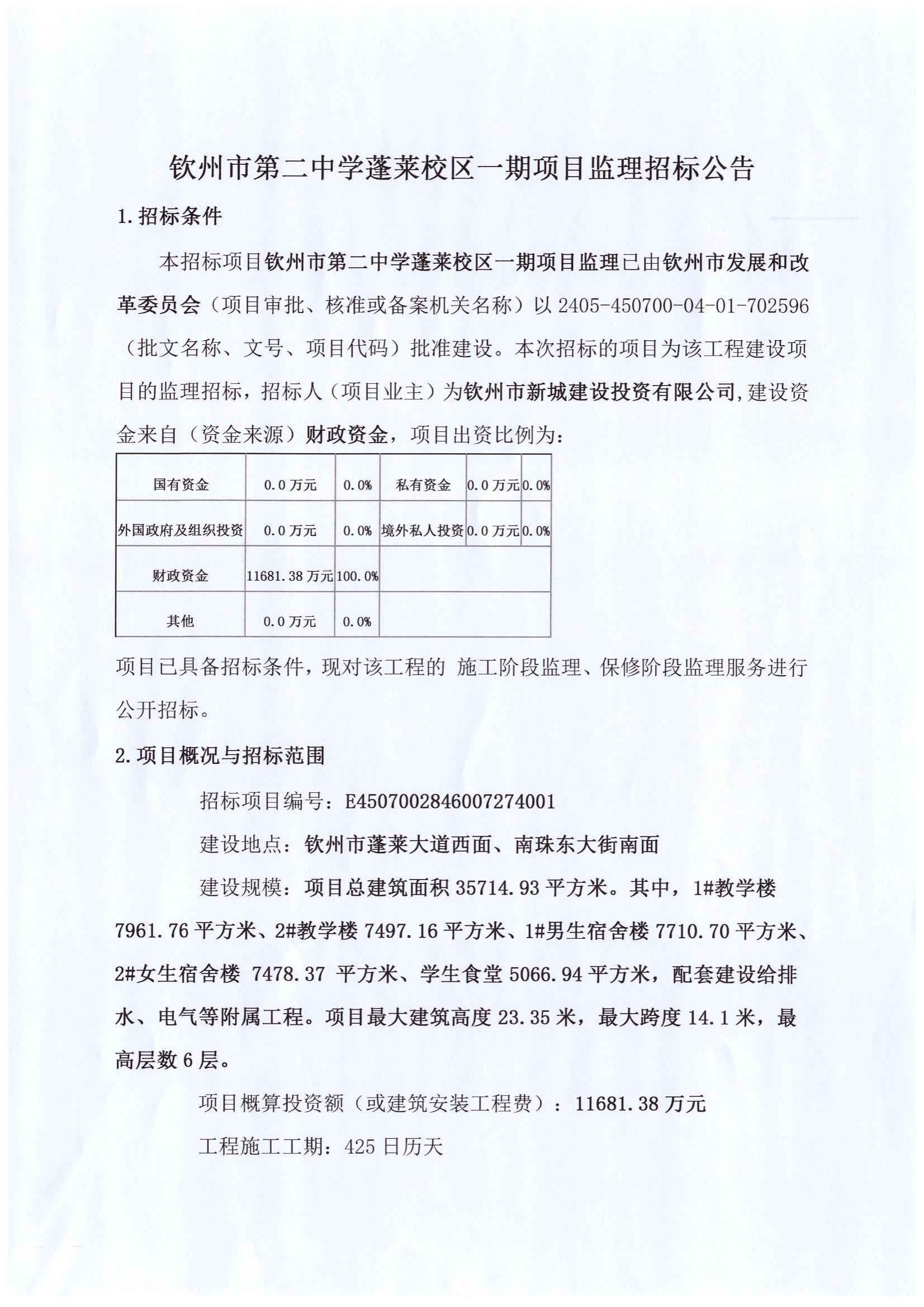欽州市第二中學(xué)蓬萊校區(qū)一期項(xiàng)目監(jiān)理招標(biāo)控制價(jià)公告