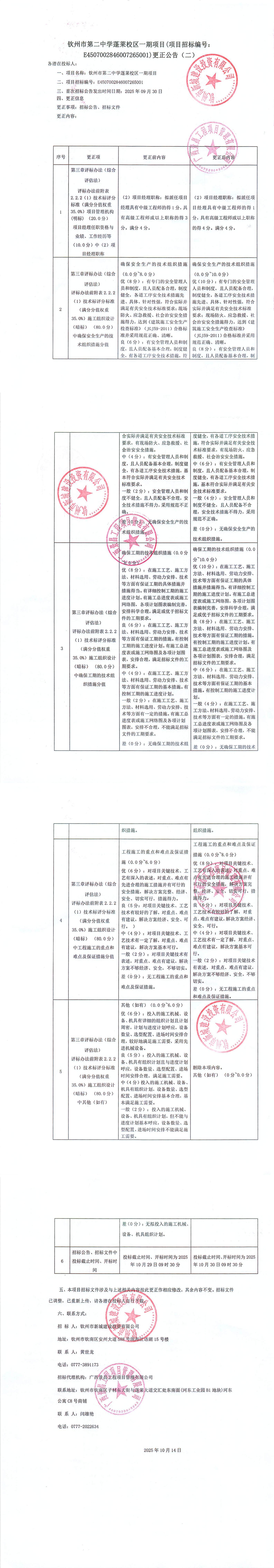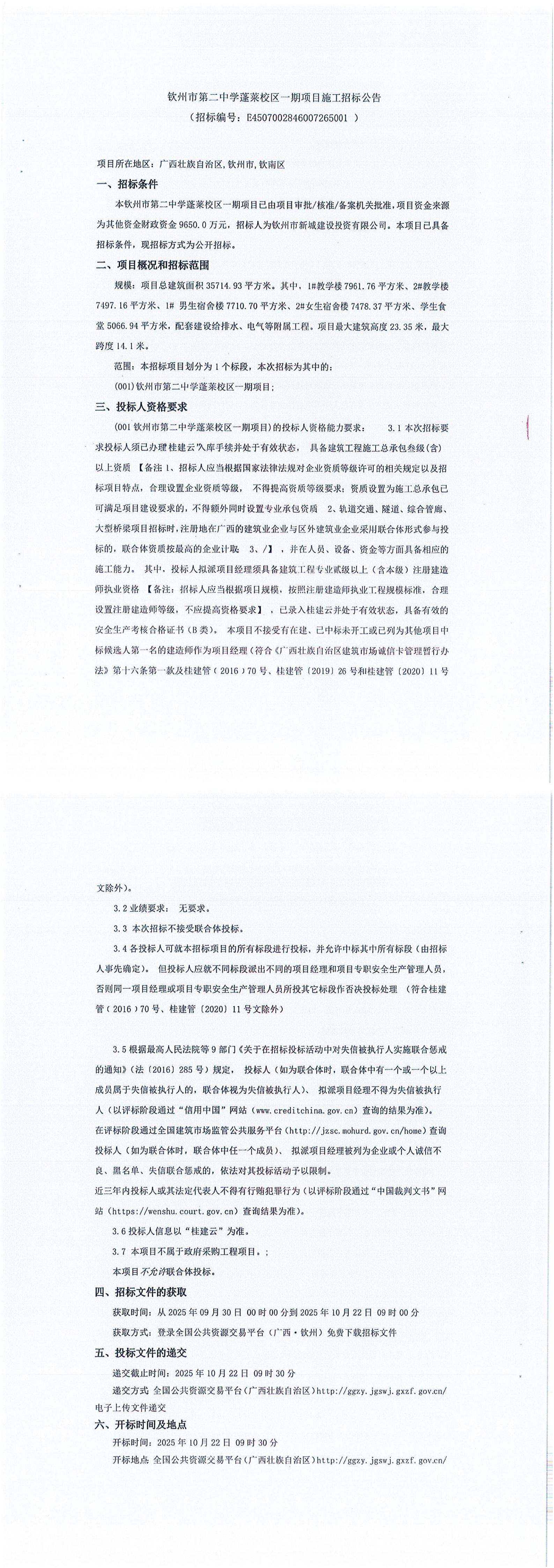欽州市第二中學(xué)蓬萊校區(qū)一期項(xiàng)目(項(xiàng)目招標(biāo)編號(hào):E4507002846007265001)更正公告(二)