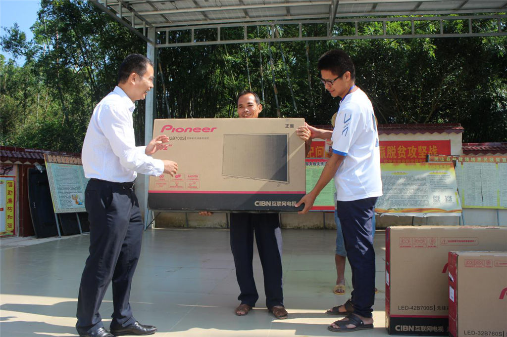 圖為集團(tuán)公司總經(jīng)理覃世金為貧困戶發(fā)放電視機(jī)