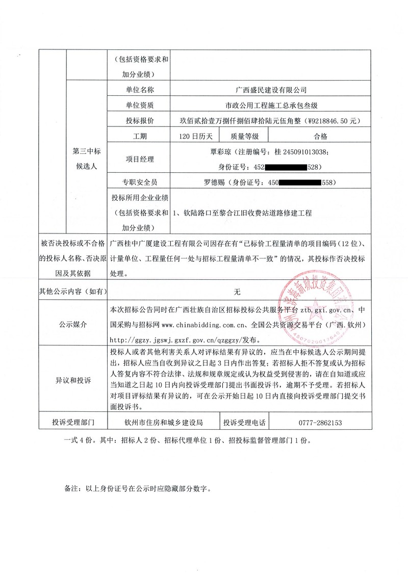 欽州市老舊城區(qū)改造提升項(xiàng)目中山路、占鰲巷道路改造及占鰲巷8號(hào)房屋加固修繕工程-中標(biāo)候選人公示